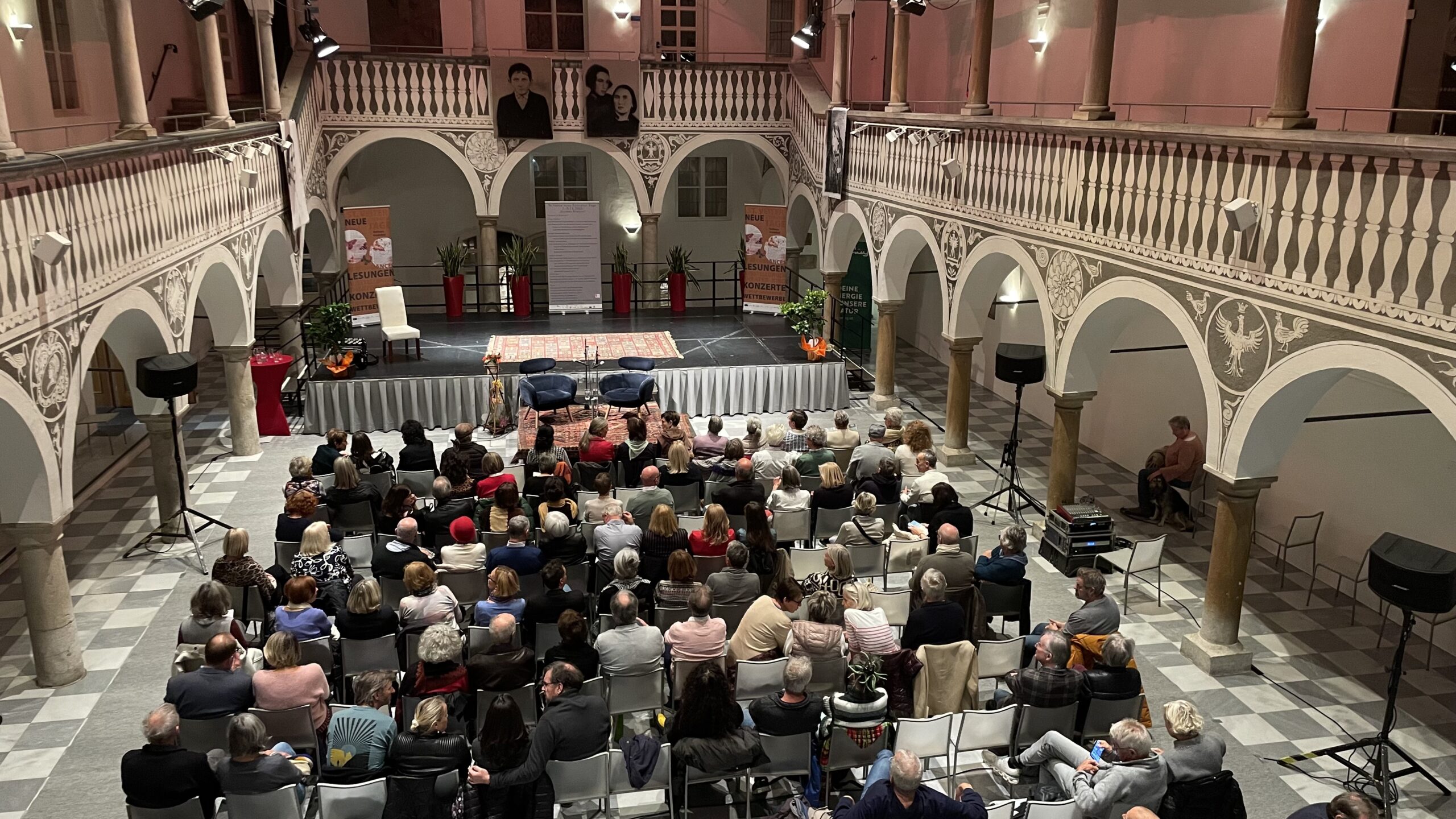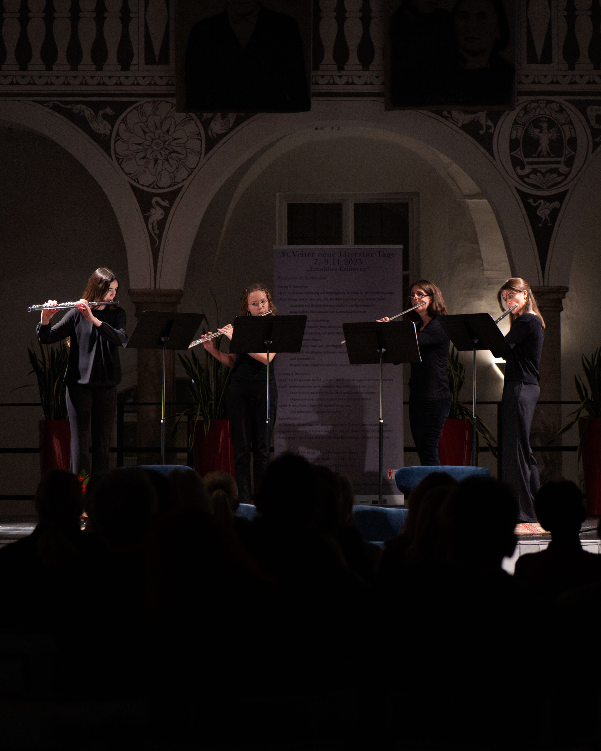 Zum Auftakt spielte das Querflötenensemble der Norbert-Artner-Musikschule zwei bewegende Stücke, während von den Arkaden im ersten und zweiten Stock dünne Papierbögen in den Hof flatterten. Dazu verlas Manuela Rader 95 ausgewählte Namen von insgesamt 198 Autorinnen und Autoren, die seit der ersten Tagung zeitgenössischer Literatur und Komposition 1950 bis zu den heurigen St. Veiter Neue Literaturtagen aus ihren Werken gelesen haben.