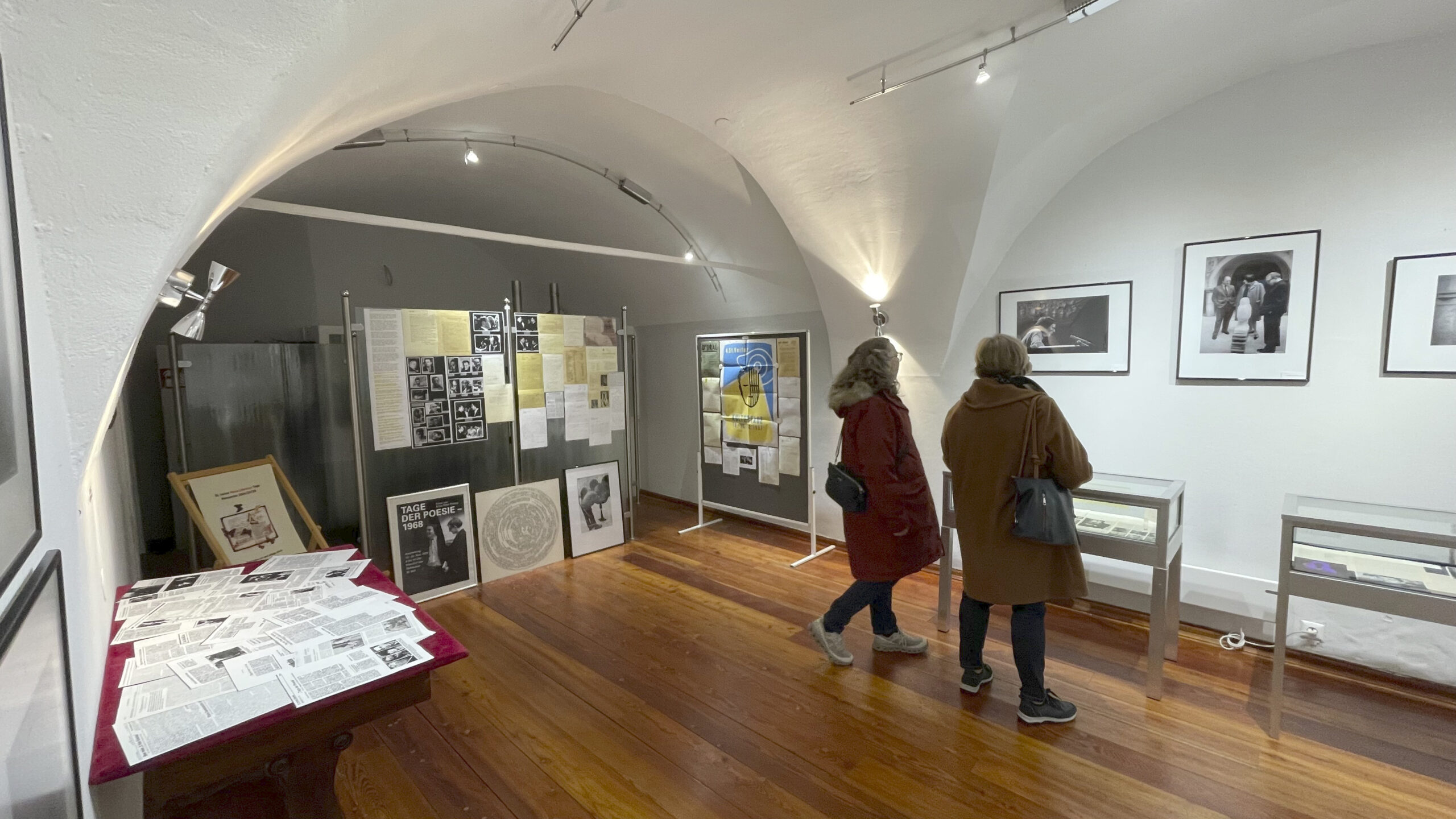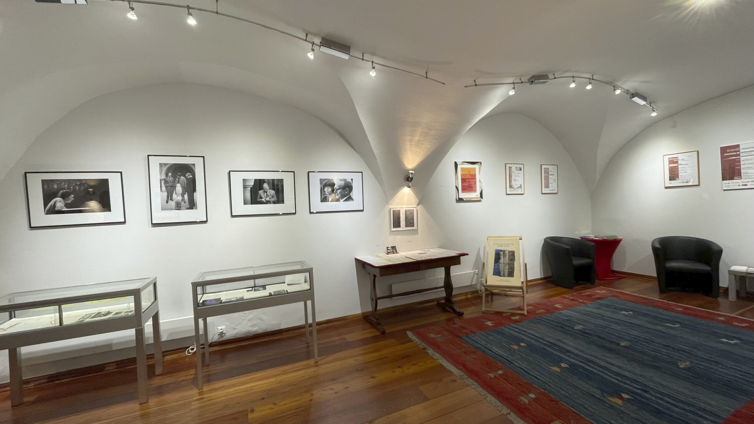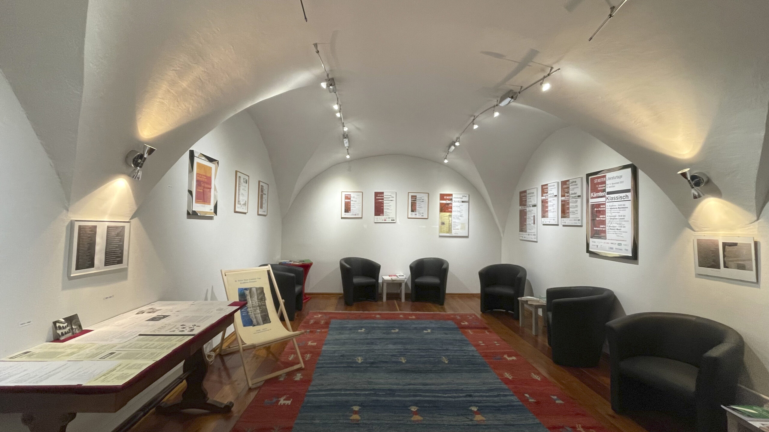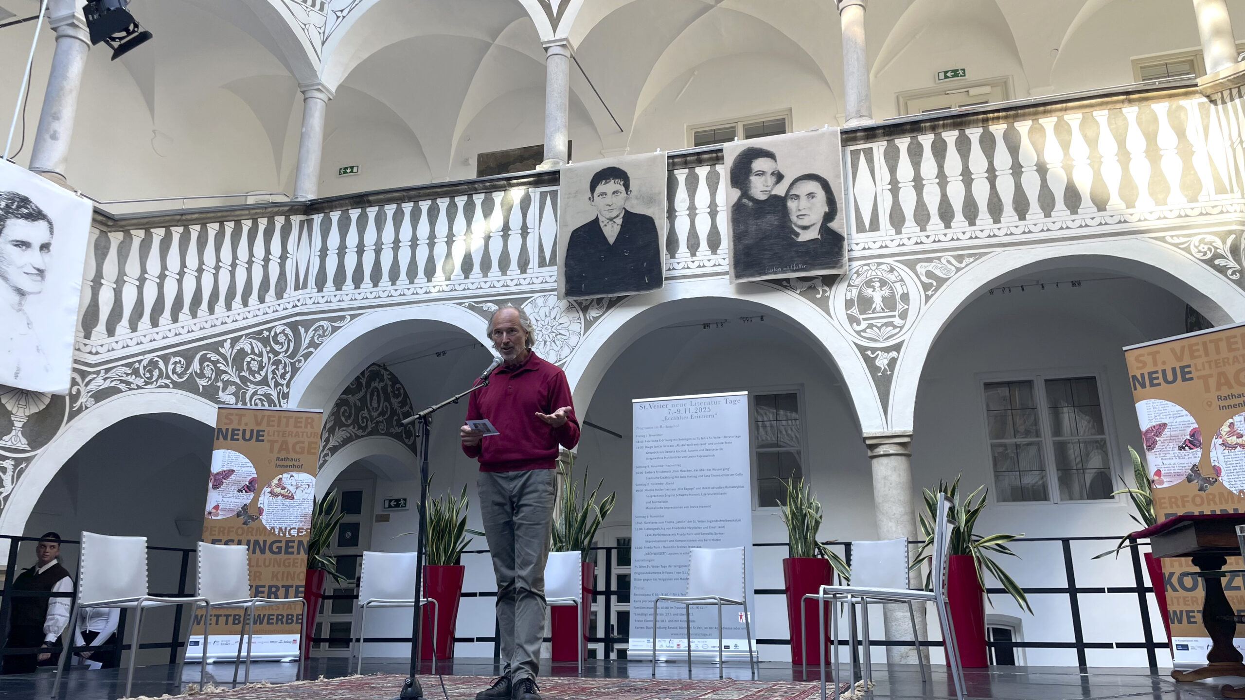 Vom Balkon hängen noch bis 24. November großformatige Bilder gegen das Vergessen von Manfred Bockelmann, und in der Seitengalerie finden sich aus 75 Jahren St. Veiter Literaturtage Exponate wie Plakate, Prospekte und Zeitungsberichte sowie Fotos von Ernst Peter Prokop. Dazu gibt es am 21.11. um 15:00 Uhr und am 24.11. um 10:30 Uhr eine Führung mit Mag. Ulrich Hagg, der die Ausstellung aus Archivmaterial und Leihgaben zusammengestellt hat. Am 24.11. um 11:30 Uhr findet eine Finissage in Anwesenheit der Kulturstadträtin Sylvia Radaelli und des Bürgermeisters Ing. Martin Kulmer statt.